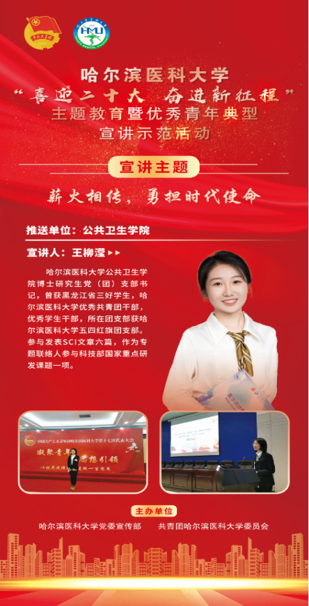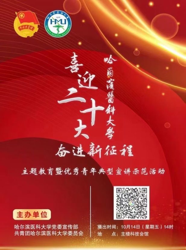 10月14日下午14时,我校隆重举办“喜迎二十大 奋进新征程”优秀青年示范宣讲会,青年师生们向祖国深情表白,以奋进姿态喜迎党的二十大胜利召开。共青团黑龙江省委员会书记徐长勇,哈尔滨医科大学党委书记张斌、校长张学等领导出席主会场宣讲会;学院党委书记李百祥等领导班子成员及学院青年师生代表在学院二楼大会议室分会场收看。我院博士研究生党(团)支部书记、黑龙江省三好学生王柳滢同学代表学院参与宣讲。