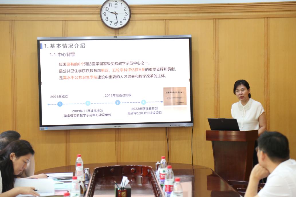 中心主任李颖教授从管理与运行机制、教学与人才培养、教学改革与研究、教学条件保障、教学团队建设、示范引领成效、特色亮点与创新七个方面对示范中心近五年的整体工作进行了汇报。评审专家组对预防医学示范中心近五年取得的成绩给予了高度赞许,并为中心发展指明了方向。