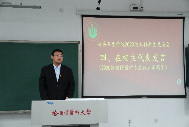 随后,2020级预防医学专业孙正华同学作为在校生代表发言。孙正华同学认为,作为大学生最重要的是热爱祖国,服务人民,同时还要有青年的社会责任感和历史使命感,踏实学习,为祖国的公共卫生事业添砖加瓦。