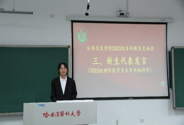 然后,2023级预防医学专业李书桐同学作为新生代表发言。李书桐回顾了新冠疫情期间公共卫生领域的专业人士为抗疫做出的巨大贡献,表达了对哈尔滨医科大学以及预防医学专业的憧憬,并表示,公卫新生将牢记习近平总书记的嘱托,“肩负时代责任,高扬理想风帆”,踏实勤勉,传承大医精神,努力成为符合国家需要、人民需要的复合型高层次公共卫生人才。