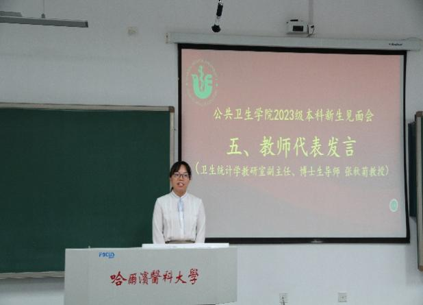 在学生代表发言完毕后,张秋菊作为教师代表发言。她从师长的角度出发,在学习、生活等方面为2023级新生提出了建议与希望,叮嘱同学们在未来五年的大学生活里树立远大目标,以勤奋积极的态度认真学习专业知识,努力提升自身素养,为将来投身公共卫生事业奠定扎实的专业基础。