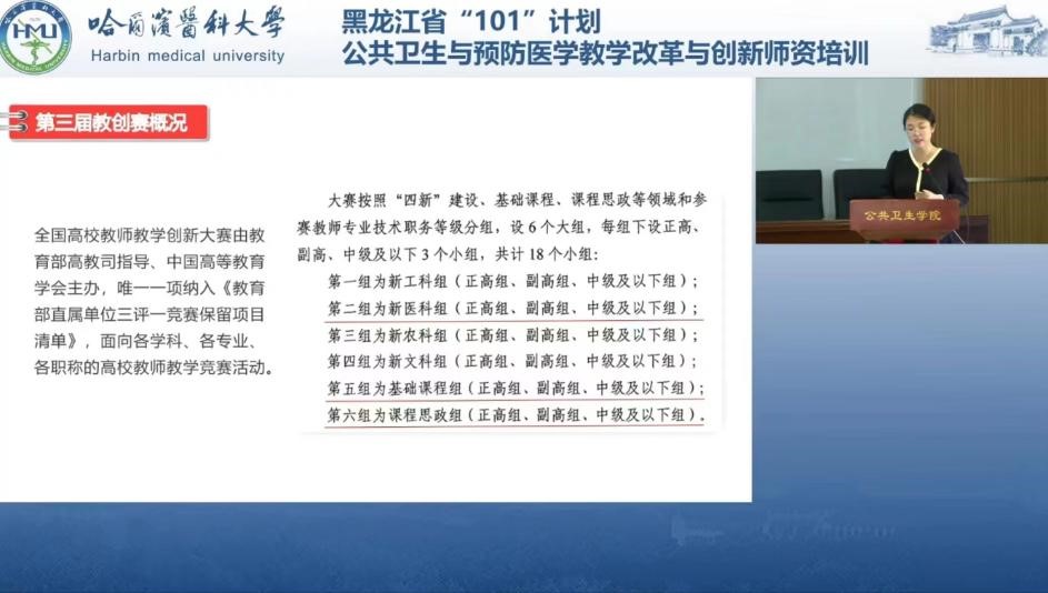 为提升教师教育教学创新能力,加强教师队伍建设,我院启动《黑龙江省“101”计划 公共卫生与预防医学教学改革与创新》师资培训活动。2023年10月24日,我院流行病学教研室孟姝含老师受邀做主题“教学创新大赛经验分享”的首场专题讲座。