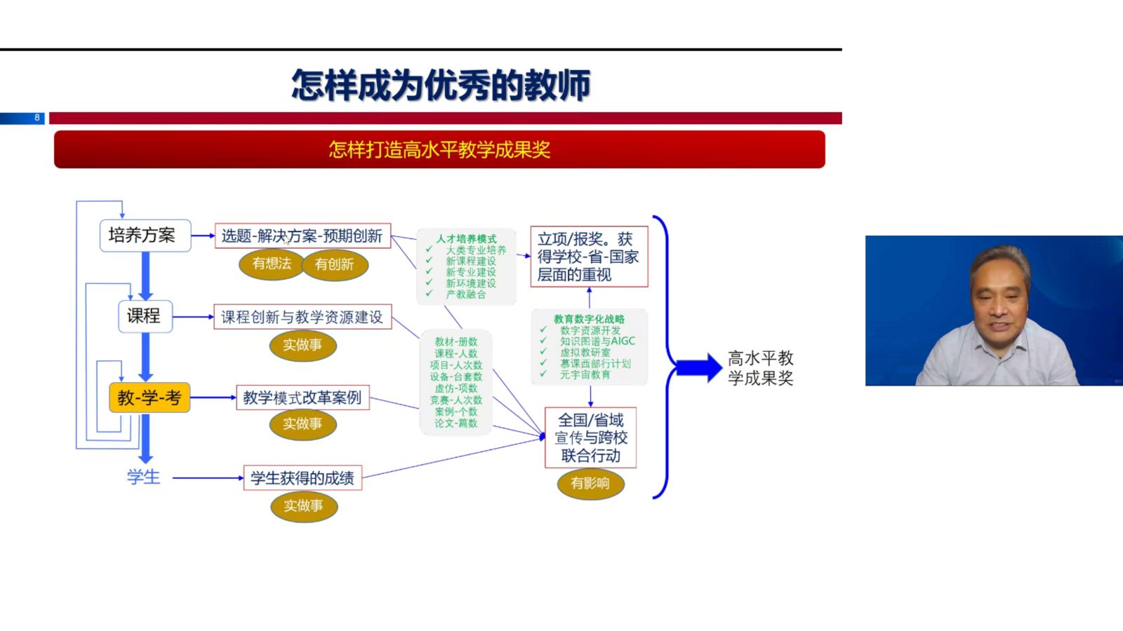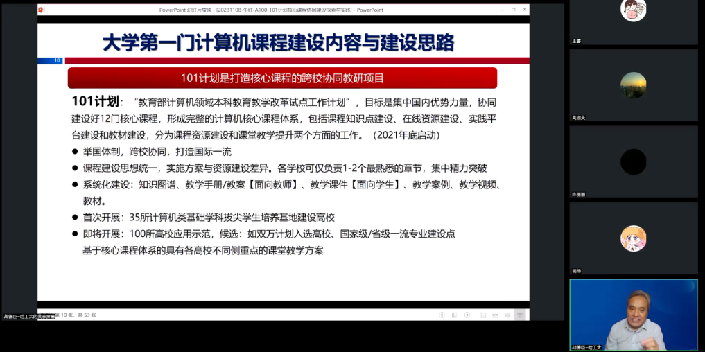 讲座中,战德臣教授深度剖析了“101计划”核心课程建设的内涵是跨校协同教研项目,并“以大学计算机类课程”为例,从组建核心课程建设团队、明晰课程定位、明晰课程组织脉络、章节设计方法、阶梯化教学设计方法、KT-SQEP的教学设计方法、形成基于KT-SQEP的知识图普建设等多角度分享了“国家101计划”《计算机概论》核心课程的建设过程和建设经验。