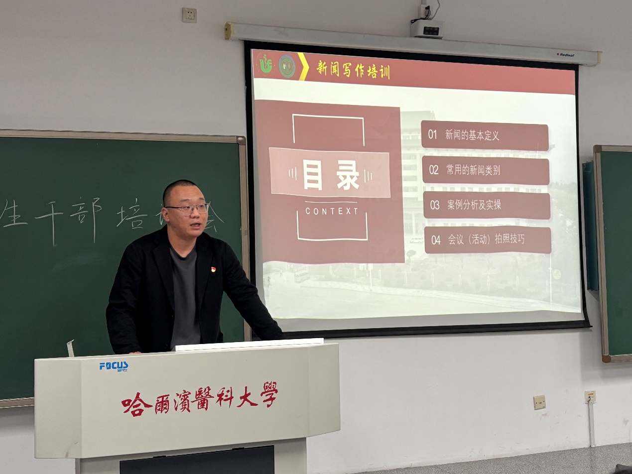 四月的杏林风抚绿梢,暖意融融。在这个宁静祥和的春日夜晚,哈尔滨医科大学公共卫生学院于4月15日晚,在学院20号教室,对本科学生干部进行培训。会议主要培训了大家新闻稿写作和照片拍摄技能,旨在提高各位学生干部的公文写作能力和活动照片拍摄质量。会议由张程老师主持,学院党委办公室宋文兴副主任主讲,学院学生党总支副处级辅导员王国华老师作总结性发言,学院本科学生干部及辅导员出席会议。各位参会者受益匪浅,感触颇深。