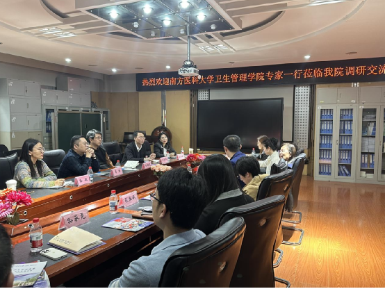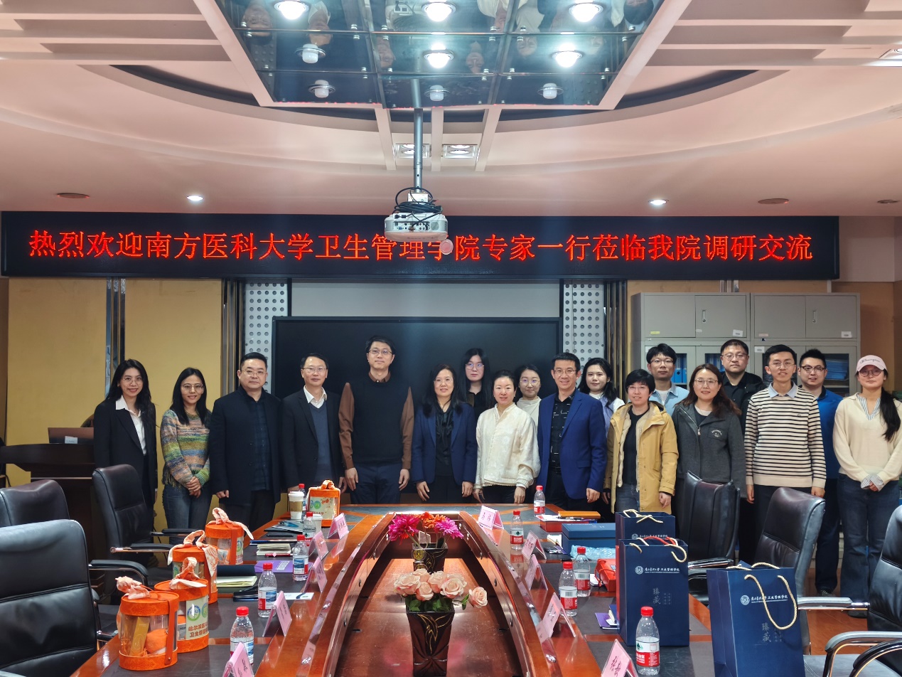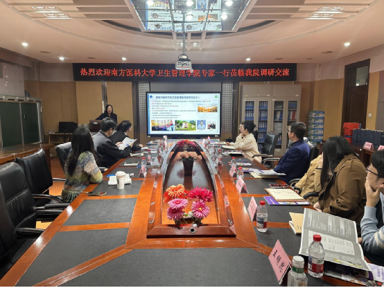 2026年4月11日,南方医科大学卫生管理学院副院长张持晨、教研办主任洪亦卿、学工办主任孙敏、国际项目办主任欧玮艳、经济系主任常路一行莅临我院调研考察。卫生管理学院院长郝艳华、副院长康正、副院长焦明丽及各教研室、行政科室相关教师代表参加座谈交流。