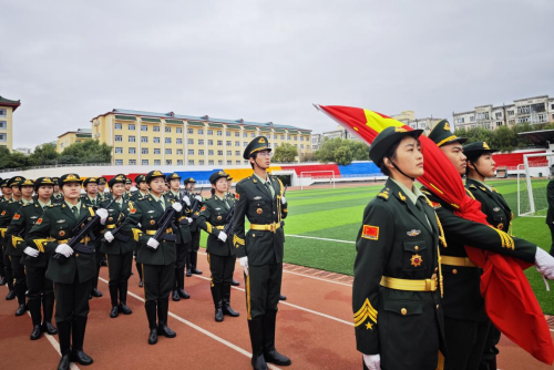国旗护卫队迎着朝阳,迈着铿锵有力的步伐走向升旗台;庄严的国歌声响彻整个校园,鲜艳的五星红旗迎风飘扬,冉冉升起,全体观礼人员肃然而立,满心皆怀爱国情,共祝伟大祖国巍巍山河永昌、国家繁荣富强。