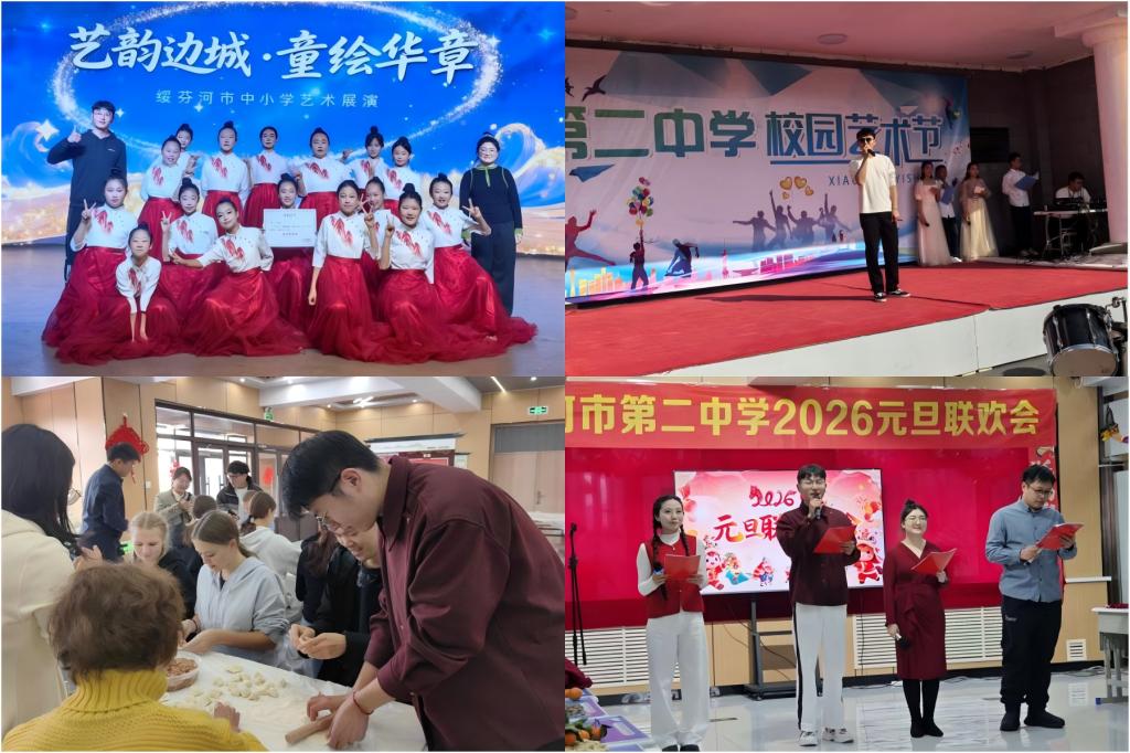 我充分发挥文艺特长,与学校老师共同组织训练校舞蹈队,在绥芬河市中小学生艺术展演中,我们的节目荣获“视觉惊艳奖”,看到孩子们在舞台上绽放光芒,我无比自豪。在学校“第二十九届校园艺术节”我为全体师生献上最真挚的歌声。在中俄学生交流活动中,我与俄罗斯朋友们一起包饺子,亲身感受到了绥芬河作为口岸城市独有的开放与包容魅力。年末,我有幸与三位二中教师一起主持了第二中学元旦联欢会,灯光璀璨下,与全体师生共庆新年,欢声笑语中,满是如家一般的温馨与喜悦。