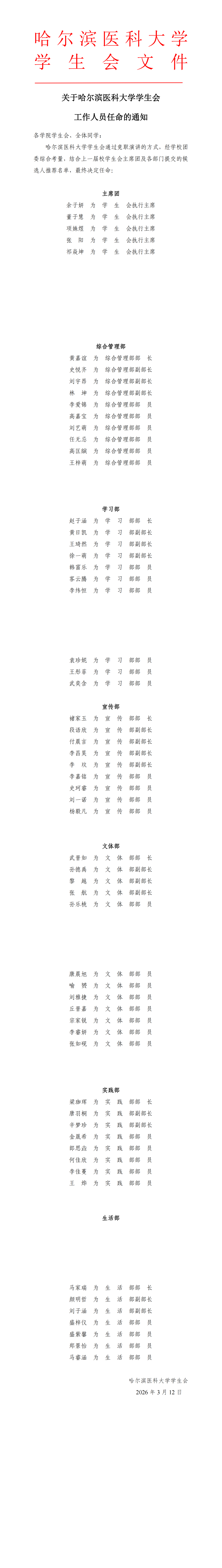 哈尔滨医科大学学生会通过竞职演讲的方式,经学校团委综合考量,结合上一届校学生会主席团及各部门提交的候选人推荐名单,最终决定任命工作人员名单如下。