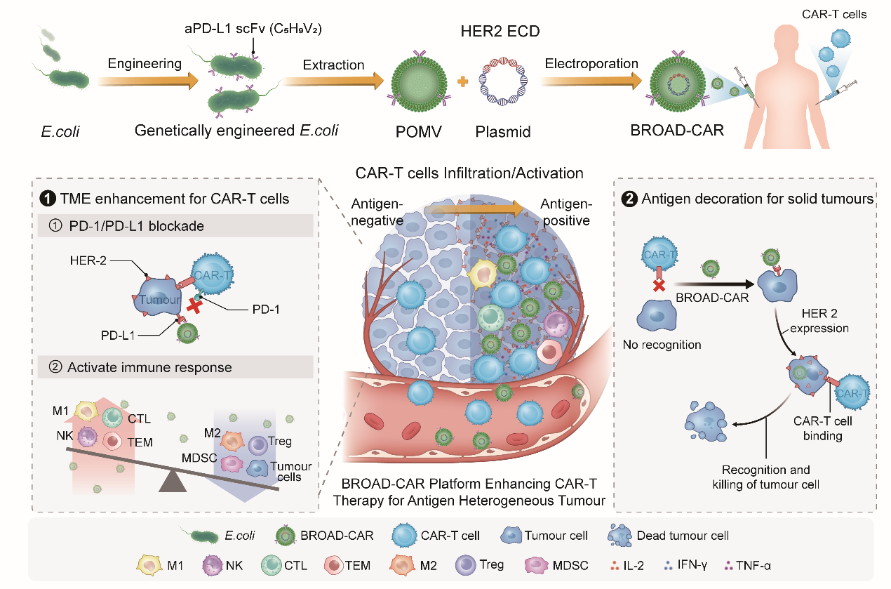 近日,哈医大肿瘤医院郑桐森教授团队在肿瘤免疫治疗领域取得重要进展,研究论文《Engineered outer membrane vesicles enhance solid tumour CAR-T cell therapy》发表在《Nature Biomedical Engineering》(2026,IF:26.7)。研究团队成功开发出基于细菌外膜囊泡(OMV)的新型CAR-T赋能平台—“BROAD-CAR”。该平台集成免疫抑制逆转与抗原修饰功能,显著提升CAR-T细胞在抗原异质性实体瘤中的治疗效果,为拓宽CAR-T疗法的临床应用提供通用型的解决策略。