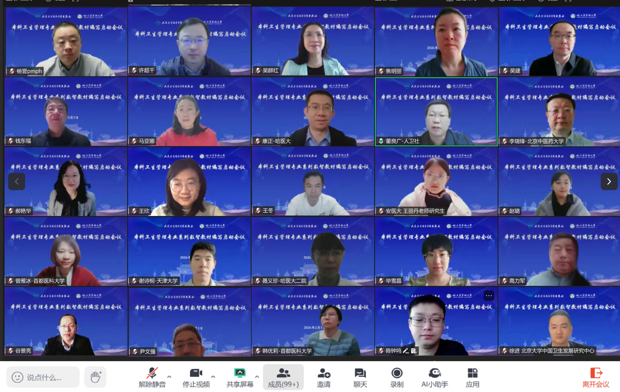 2月5日,由人民卫生电子音像出版社主办、哈尔滨医科大学卫生管理学院承办的本科卫生管理专业系列数智教材线上编写启动会顺利召开。来自北京大学、清华大学、复旦大学、南方医科大学、南京医科大学、北京中医药大学、首都医科大学、中国医科大学、安徽医科大学、华中科技大学、天津大学、中山大学、山东大学、武汉大学、西安交通大学、吉林大学、四川大学、陆军军医大学等全国76所知名院校及医院的185位教材编委参加会议。人民卫生出版社副总编辑杨晋、哈尔滨医科大学副校长许超千、人民卫生电子音像出版社副总经理董良广以及各教材编辑参加会议。