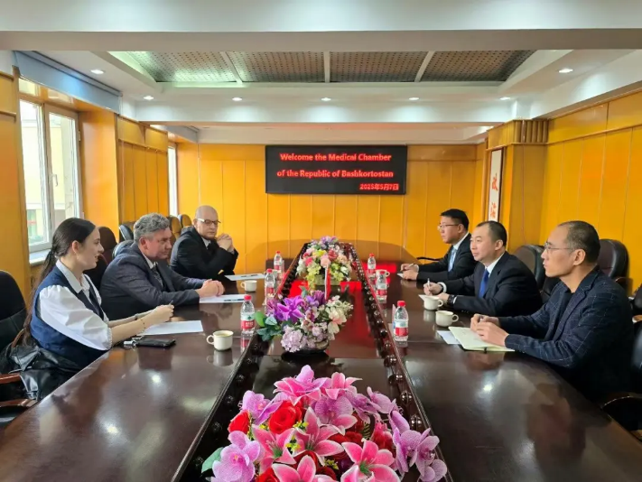 5月7日上午,俄罗斯巴什科尔托斯坦共和国医学会主席A.R. Baitimerov教授率团访问哈尔滨医科大学药学院,双方围绕深化科研合作、促进成果转化及加强人才培养等议题进行深入洽谈。药学院院长张勇、副院长谢良军、副院长梁海海等出席会议。