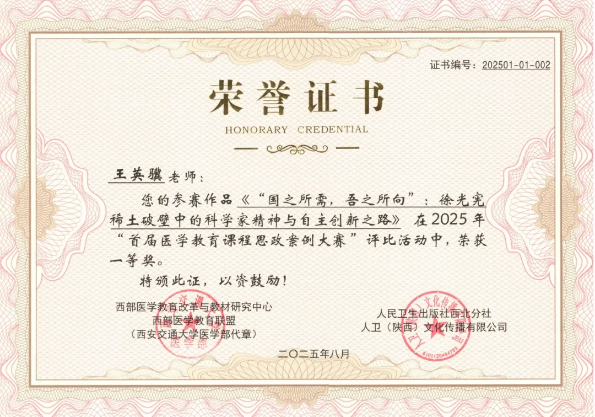 近日,首届医学教育课程思政案例大赛评选结果揭晓,我院无机化学与物理化学教研室王英骥副教授凭借其作品《“国之所需,吾之所向”:徐光宪稀土破壁中的科学家精神与自主创新之路》脱颖而出,荣获一等奖殊荣。此次获奖充分展现了我院在医学教育与思政育人融合创新方面的突出成果。