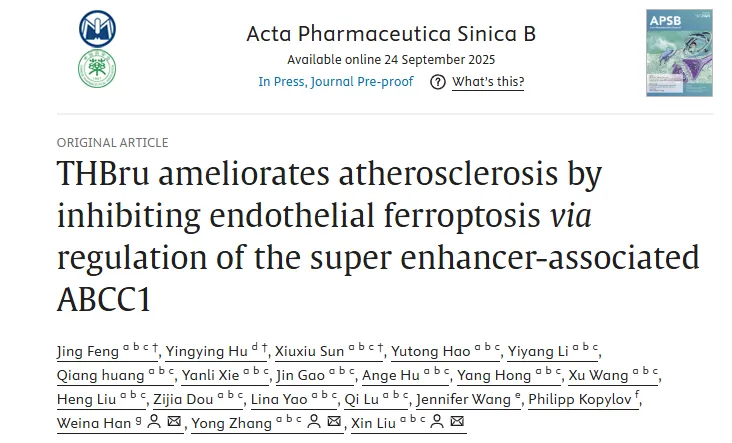 近日,我院寒地心血管病全国重点实验室杨宝峰院士团队张勇教授课题组在动脉粥样硬化研究领域取得新进展,研究成果《THBru ameliorates atherosclerosis by inhibiting endothelial ferroptosis via regulation of the super enhancer-associated ABCC1》被国际知名药学期刊《Acta Pharmaceutica Sinica B》(影响因子:14.6)收录并正式发表。