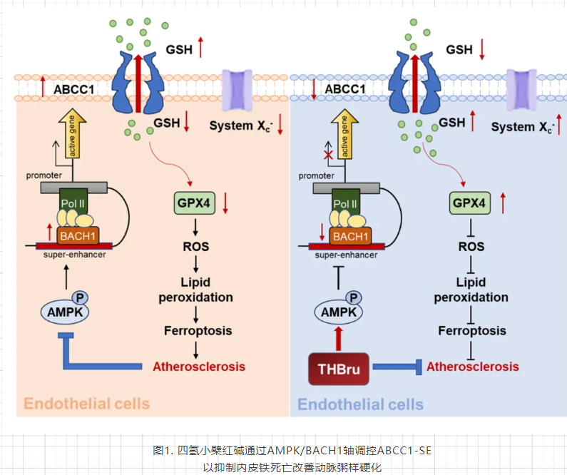 动脉粥样硬化是一种与内皮功能障碍密切相关的慢性血管疾病。铁死亡作为导致内皮功能障碍的重要因素,在动脉粥样硬化进展中起关键作用,针对内皮铁死亡的药物研发为动脉粥样硬化提供了潜在治疗策略。本研究旨在评估四氢小檗红碱对动脉粥样硬化的潜在影响,并阐明其内皮保护作用的分子机制。结果表明,四氢小檗红碱可显著减少动脉粥样硬化小鼠主动脉斑块形成。通过转录组测序及后续验证,发现四氢小檗红碱通过增强谷胱甘肽稳态和减少活性氧(ROS)积累,减轻动脉粥样硬化中的内皮铁死亡。机制上,生物信息学分析显示四氢小檗红碱可降低超级增强子(SE)调控基因ATP结合盒转运体C亚家族成员1(ABCC1)的表达。转录因子BTB与CNC同源蛋白1(BACH1)通过结合ABCC1的超级增强子(ABCC1-SE)驱动其转录,而四氢小檗红碱能有效抑制ABCC1-SE的活性。此外,四氢小檗红碱可促进腺苷酸活化蛋白激酶(AMPK)的激活,从而负向调控BACH1及其下游的ABCC1/铁死亡信号通路。综上,本研究首次发现四氢小檗红碱可作为动脉粥样硬化治疗的潜在候选药物,同时揭示其通过AMPK/BACH1轴调控ABCC1-SE以抑制内皮铁死亡的新机制。
