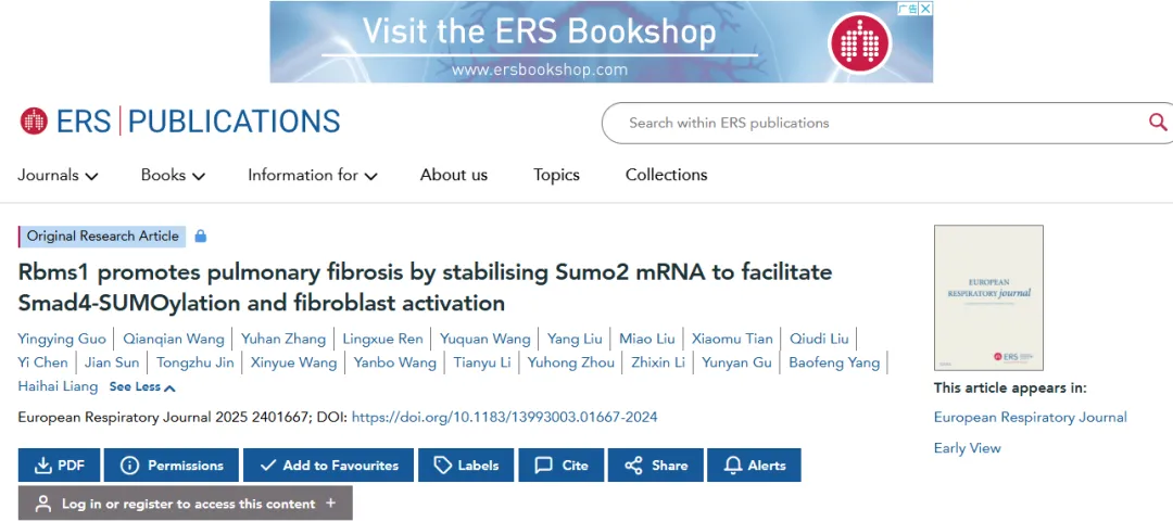 近期,我院寒地心血管病全国重点实验室杨宝峰院士团队梁海海课题组在特发性肺纤维化研究领域取得新进展,研究成果《Rbms1 promotes pulmonary fibrosis by stabilizing Sumo2 mRNA to facilitate Smad4-SUMOylation and fibroblast activation》被呼吸领域国际顶级期刊European Respiratory Journal收录并正式发表。该研究由郭莹莹博士后、王倩倩博士、张玉涵硕士、任凌雪硕士作为共同第一作者完成。