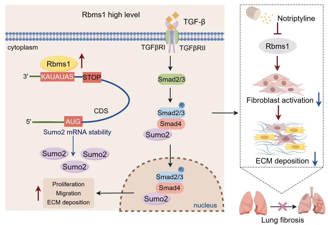 在本研究中,研究者发现RNA结合蛋白Rbms1在IPF患者肺组织和小鼠肺纤维化中显著高表达。成纤维细胞特异性敲除Rbms1可改善博莱霉素(BLM)损伤所致的小鼠肺纤维化,包括炎症浸润、胶原沉积及肺组织重构等病理改变。通过整合RNA-seq、生物信息学和分子生物学等多种技术手段,发现Rbms1结合并促进Sumo2 mRNA的稳定性,进而增加Smad4的SUMOylation。更重要的是,研究者发现去甲替林可作为Rbms1的药理学抑制剂改善BLM诱导的小鼠肺纤维化。该研究不仅为IPF的临床治疗提供关键干预靶点及原创性的理论依据,更具有重要的科学价值与临床转化潜力。