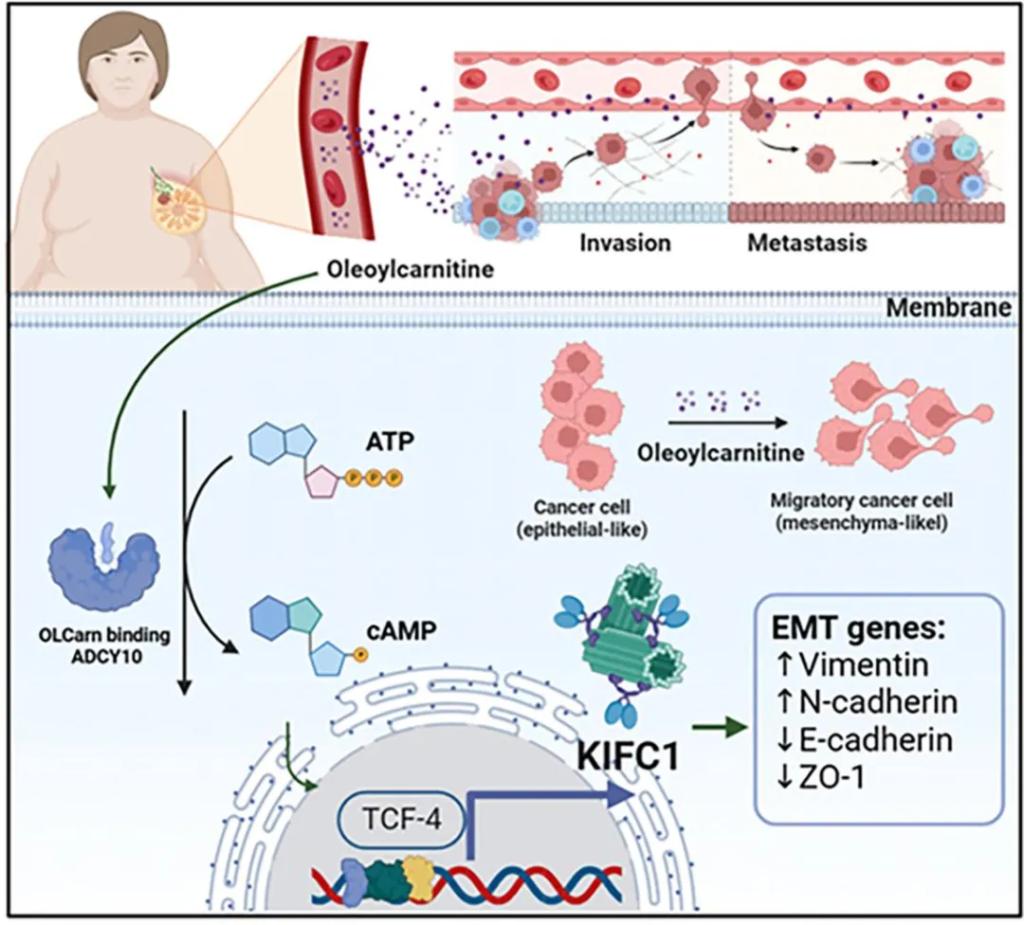 在本研究中,课题组发现肥胖小鼠血清能够诱导乳腺癌细胞高侵袭表型转换,促进乳腺癌肺转移;且去除血清中蛋白及脂肪后这一作用仍然存在,提示我们小分子代谢物发挥着重要作用。继而通过代谢组学、转录组学和靶标垂钓等手段,发现循环代谢物油酰肉碱(OLCarn)异常升高,其作为信号分子进入乳腺癌细胞,直接结合并激活ADCY10,通过转录因子TCF-4促进KIFC1的表达,重塑肿瘤细胞的转录调控网络,促进乳腺癌的迁移和侵袭。本研究揭示了肥胖导致的代谢紊乱在肿瘤转移中的关键作用,并证明了小分子代谢物是肥胖与肿瘤转移的重要“桥梁”。OLCarn有望成为肥胖相关的乳腺癌潜在诊断风险因子以及治疗靶点。
