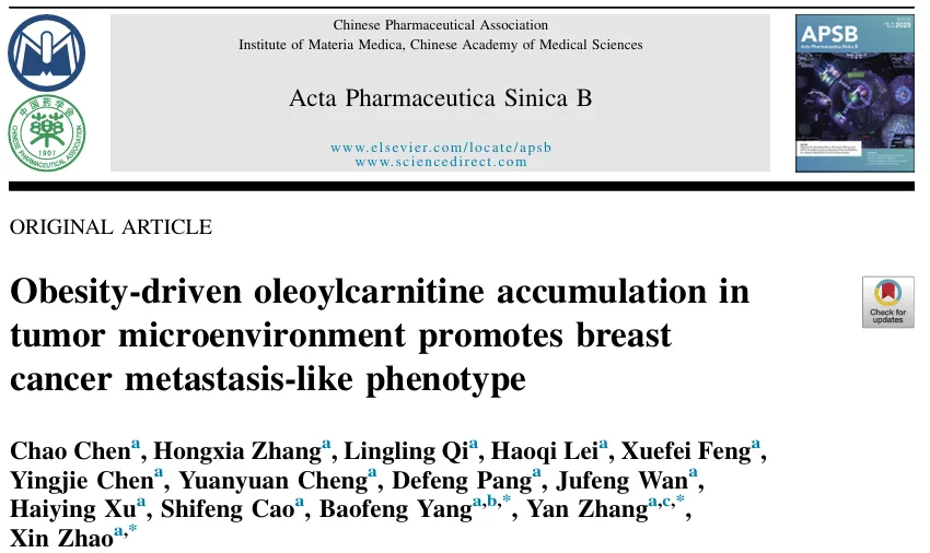 近期,我院寒地心血管病全国重点实验室杨宝峰院士团队张妍课题组在肥胖与乳腺癌转移机制研究方面取得重要突破,研究成果《Obesity-driven oleoylcarnitine accumulation in tumor microenvironment promotes breast cancer metastasis-like phenotype》被药学领域国际期刊Acta Pharmaceutica Sinica B(中科院一区,IF=14.7)收录并正式发表。