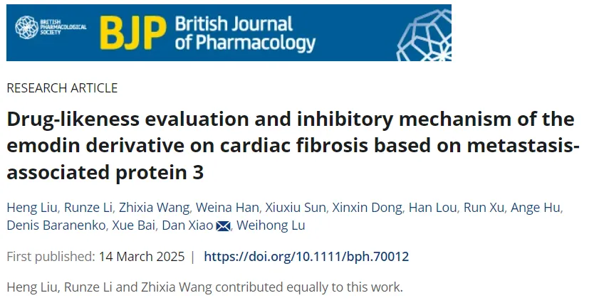 近日,我院药学实验教学中心刘亨老师与哈尔滨工业大学郑州研究院肖丹副研究员合作在心肌纤维化的药物研究领域取得新进展,研究成果《Drug-likeness evaluation and inhibitory mechanism of the emodin derivative on cardiac fibrosis based on metastasis associated protein 3》被药理学领域国际著名期刊《British Journal of Pharmacology》收录并正式发表。