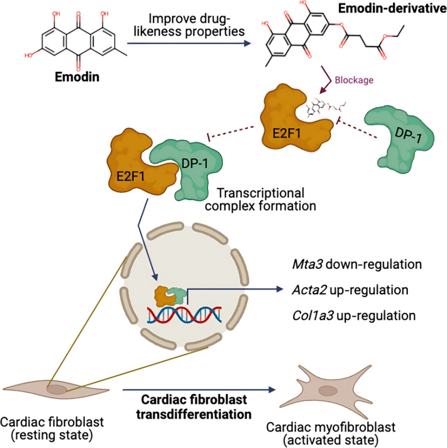 本研究发现,大黄素衍生物通过3'-OH位点修饰,促进了药物的吸收、分布、代谢和排泄过程,生物利用度提高。同时,在体内外模型中,大黄素衍生物表现出优于大黄素的抗心肌纤维化效果。通过生物信息学与分子对接分析发现,大黄素衍生物通过调控转录因子E2F1通路,恢复MTA3蛋白水平。功能学实验表明,敲低MTA3可逆转大黄素衍生物的抗心肌纤维化效果,证明MTA3是其关键下游靶点。计算机辅助药物设计分析结果表明,大黄素衍生物通过阻断E2F1与MTA3启动子结合发挥作用。本研究证实了大黄素衍生物通过靶向E2F1/MTA3信号轴,发挥抗心肌纤维化作用,为心肌纤维化的治疗提供新策略。