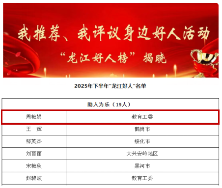 近日,黑龙江省文明办组织的“我推荐、我评议身边好人”活动正式揭榜,经学校推荐、资格审查、负面核查、网络评议、专家评审等环节,全省51人获评2025年下半年“龙江好人”,我校马克思主义学院周艳娟教授成功当选。